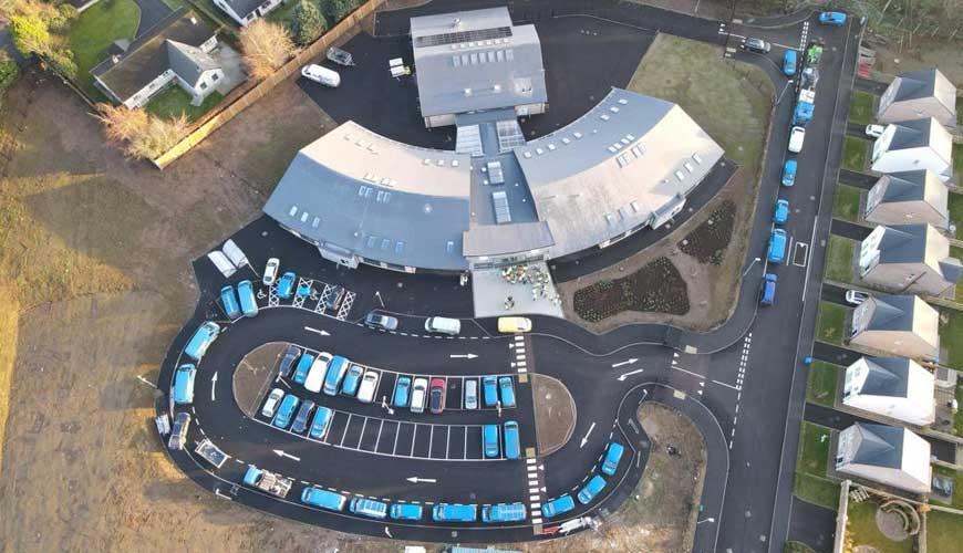 External works comprise a 35-space carpark, drop-off layby & separate